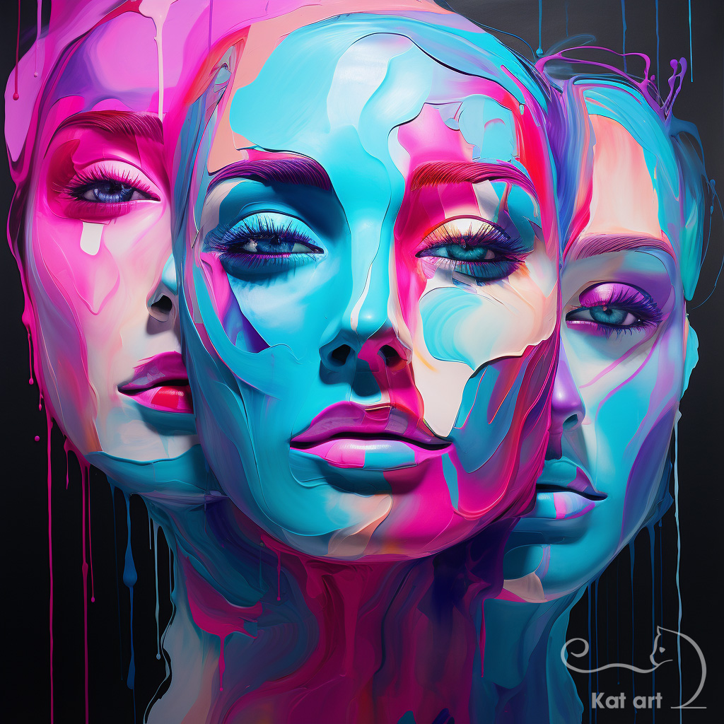 AI-kunst van Kat art van drie vrouwen hoofden gedrenkt in verf, in een schilderachtige stijl.