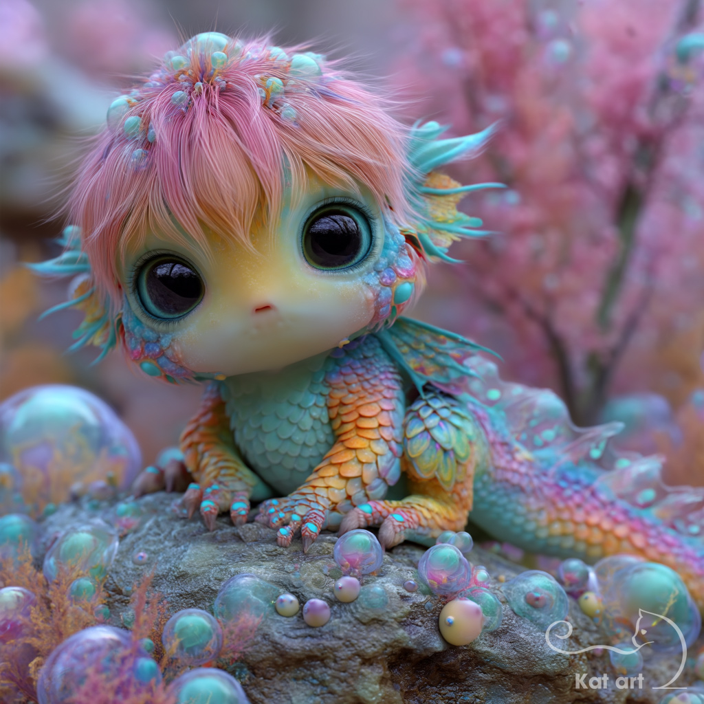 AI-kunst van Kat art van een fluffy baby draakje in pastel kleuren, in een 3D-art stijl.