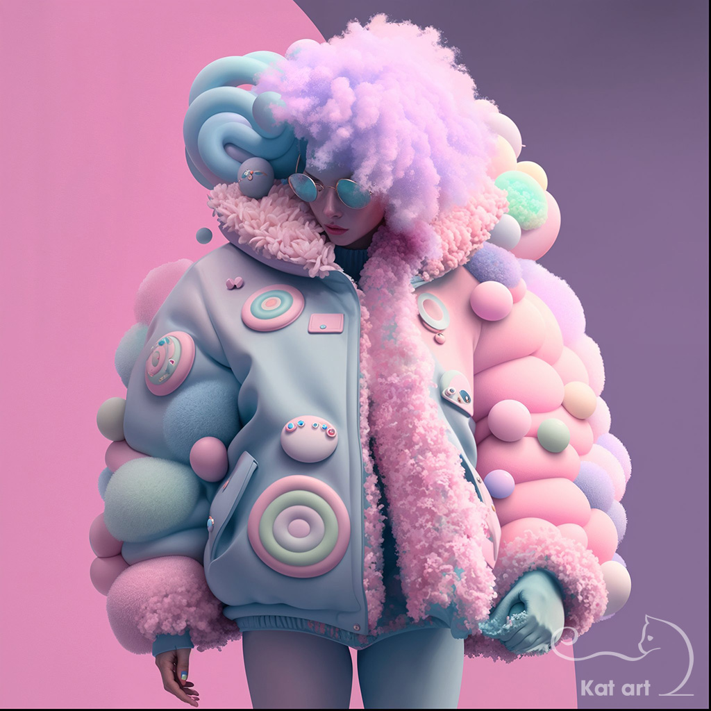 AI-art from Kat art of a woman in a fluffy cyberoutfit in pastel colors, in a 3D-art style.