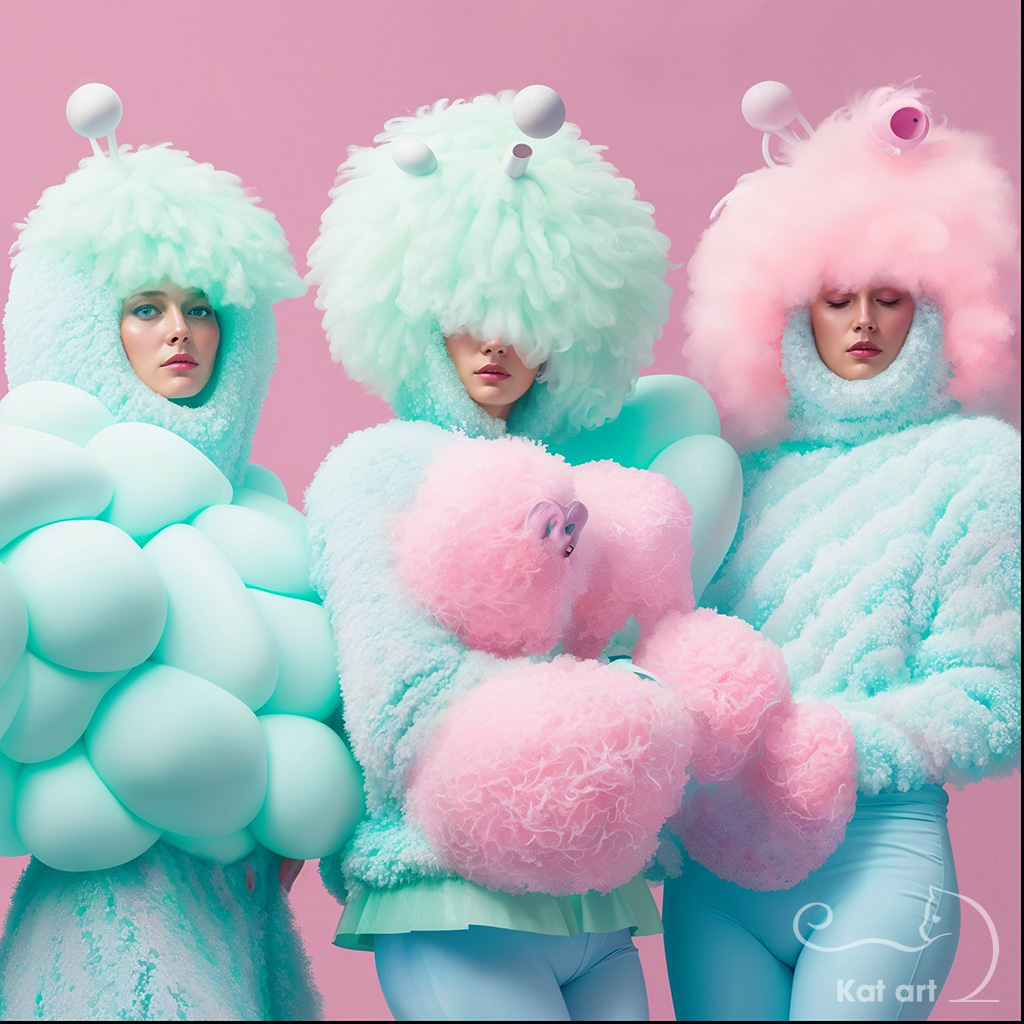 AI-art from Kat art of three women in a fluffy cyberoutfit in pastel colors, in a 3D-art style.