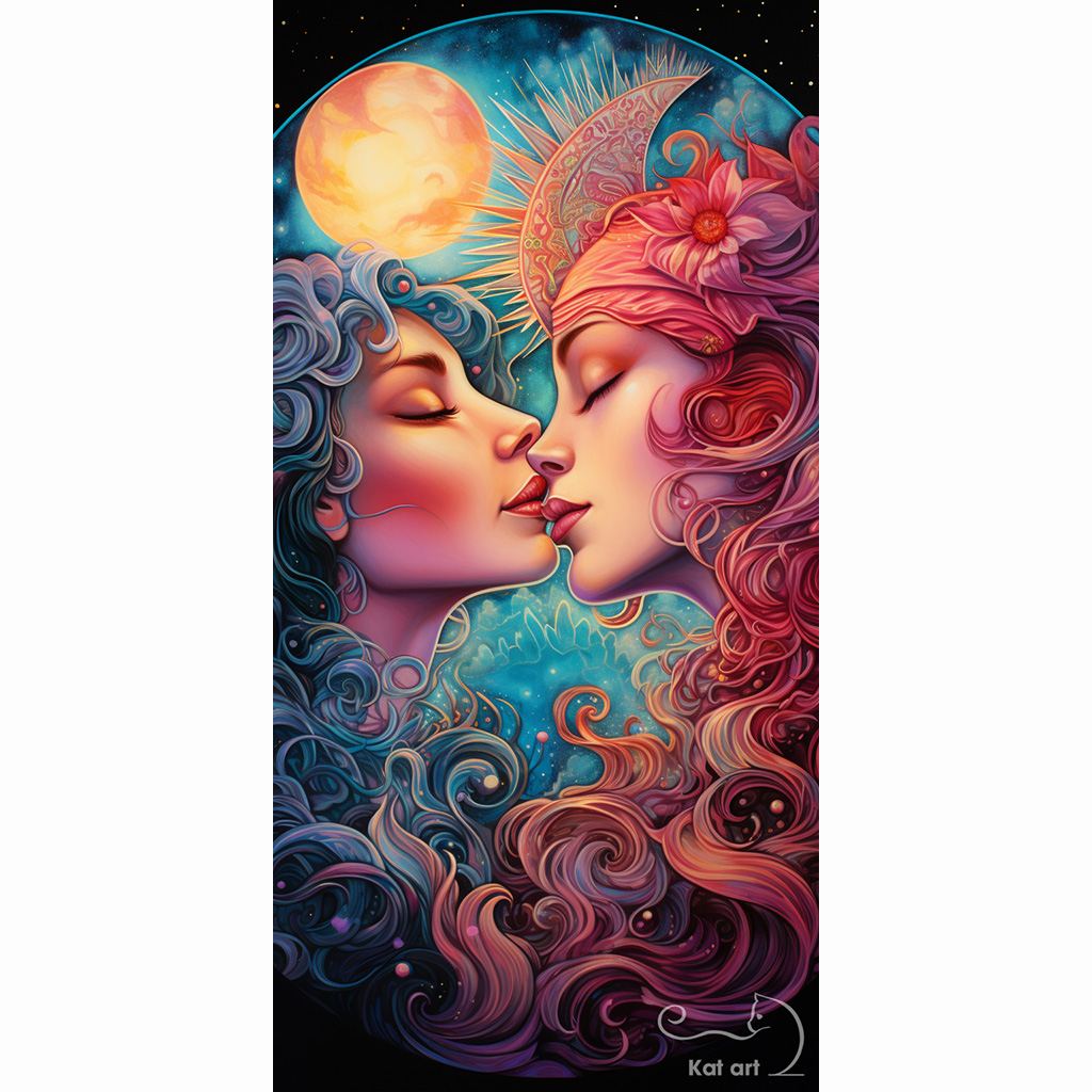 AI-kunst van Kat art van twee vrouwen en de maan, in een tekenachtige Jugendstil stijl.