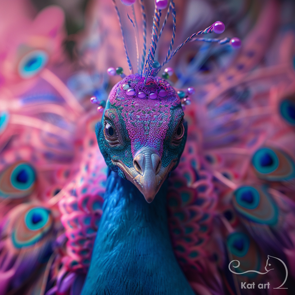 AI-kunst van Kat art van een prachtige pauwenkoningin, in een 3D-art stijl.