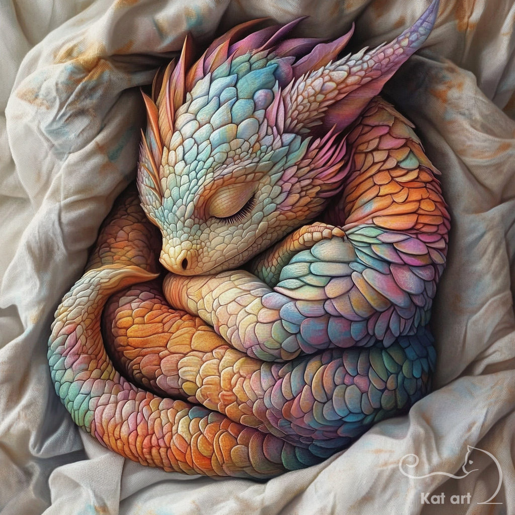 AI-art from Kat art of a sleeping baby dragon in metallic colors, in a 3D art style.