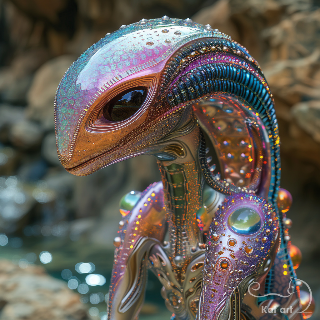 AI-art from Kat art of an alien amphibian, called Salamorah, in a 3D art style.