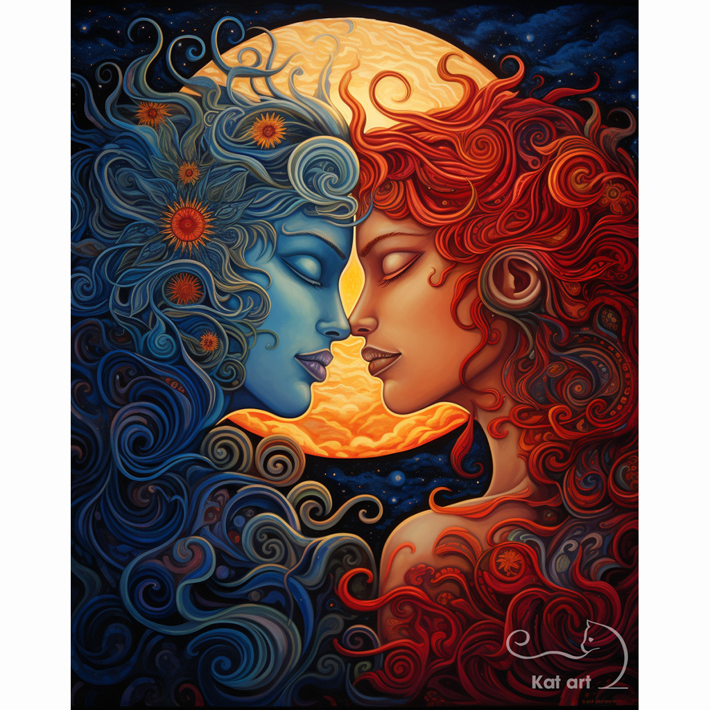 AI-kunst van Kat art van twee vrouwen en de maan, in een tekenachtige stijl.